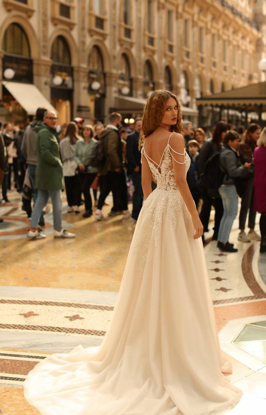 Une robe élégante en tulle délicat et empiecement en dentelle, le tout avec un jeux de brettelle fines qui habille le dos de cette marveille.