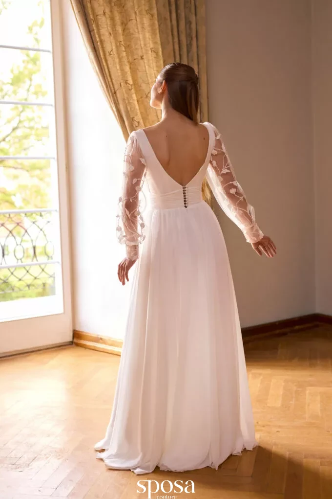 Robe de mariée bohème à manches fleuries transparentes, dos nu et jupe en mousseline fendue avec un ajout de dentelle pour une mariée raffinée.