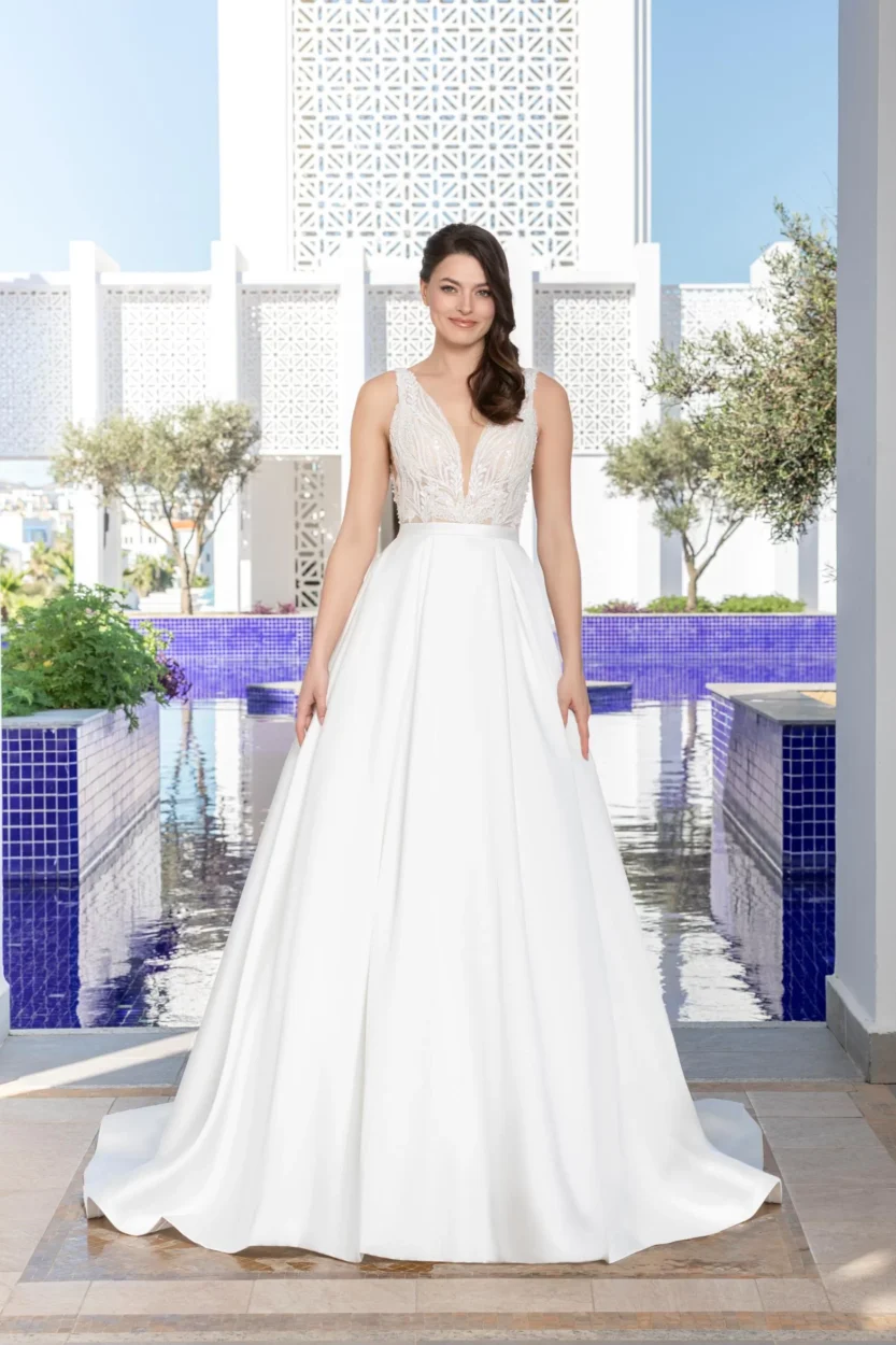 ROBE EN SATIN AVEC BUSTIER TRANSPARANT DELICATEMENT PERLE SUR LA DENTELLE