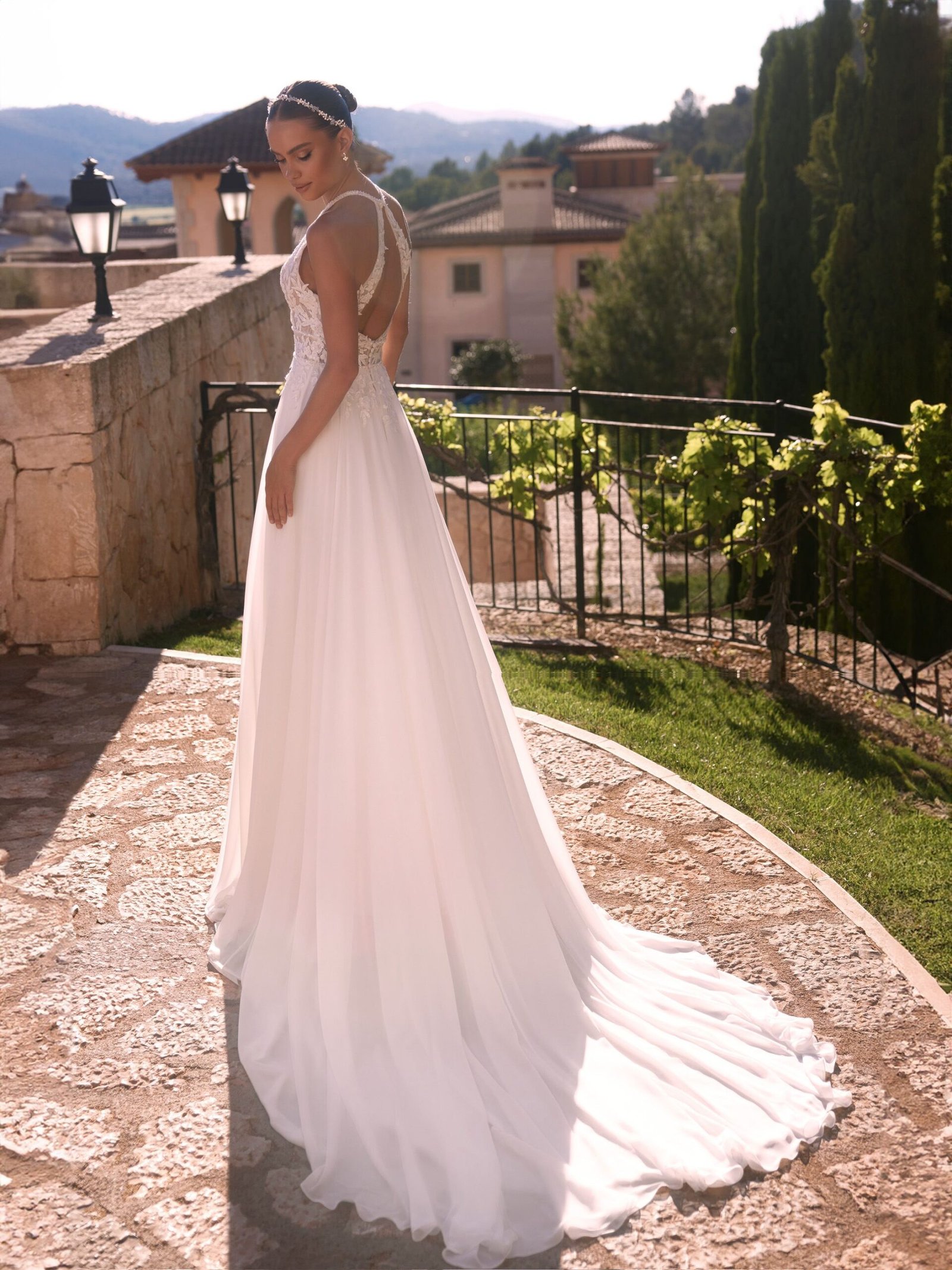 VERDI est une robe de mariée bohème trapèze fabriquée en mousseline et en dentelle de haute qualité. Elle présente une longue traîne, un dos ouvert et un col à l’américaine élégant souligné par une bordure perlée. La taille naturelle et les détails en dentelle florale de coton de haute qualité sur le corsage en font un choix magnifique. Cette robe sans manches offre un look élégant et moderne
